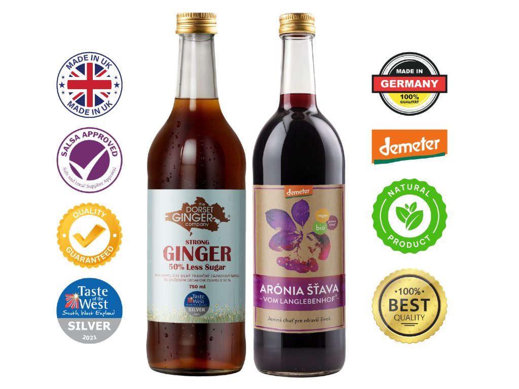 100 % bio šťáva z aronie - černá aronie, Demeter + Nealkoholický zázvorový nápoj Silný o 50 % méně cukru, 750 ml