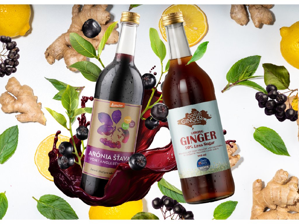 Silné spojení přírody pro vaše zdraví - čistéOrganická šťáva z aronie a léčivý zázvorový nápojSilný o 50 % méně cukru - silná intenzita zázvoru